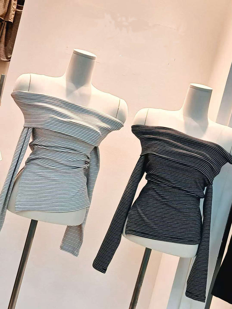 間條一字膊長袖衫